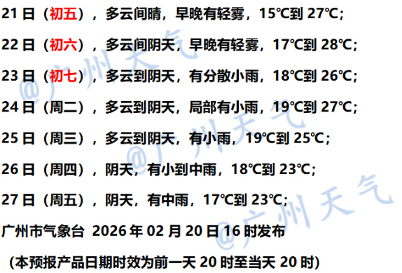 22日(初六),韶关、清远和肇庆市县多云间阴天,有小雨,其余市县多云间阴天,局部有零星小雨,大部市县早晚有(轻)雾。早晨最低气温:粤西和珠江三角洲中南部市县17~20℃,其余大部市县13~16℃。